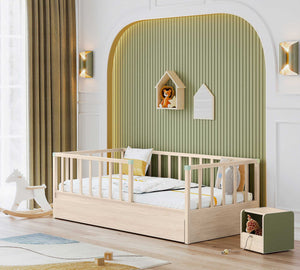 Kreveti su dizajnirani sa ogradama na 3 strane kako bi se osiguralo sigurno spavanje. Krevet se može kupiti samostalno ili uz dodatnu opciju donjeg kreveta, pružajući djetetu drugi prostor za spavanje ili idealno skladište dok raste.