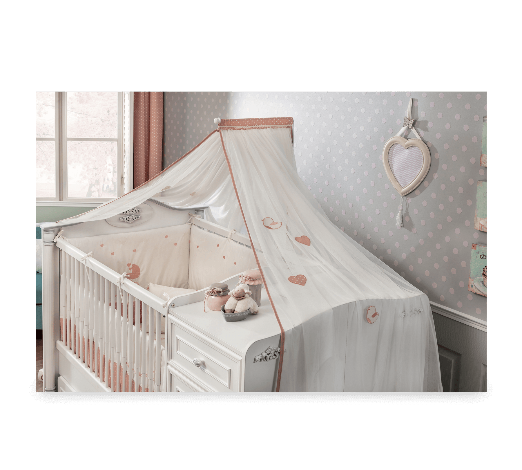 Romantična mreža protiv komaraca za bebe, koja svojim kvalitetnim izborom tkanina stvara mirno okruženje za spavanje beba, pruža visoko udobnu upotrebu. Vez i vez, koji nude primjere ručne izrade u svakom detalju, čine željenu opuštajuću atmosferu u dječjim sobama stvarnošću. Mreža protiv komaraca pokriva sve površine krevetića i kreveta iz jedne tačke, držeći bebe podalje od negativnih vanjskih faktora. Boje koje se koriste u tkaninama i tkanju jačaju veselu atmosferu dječjih soba, a istovremeno doprinose elegantnom i korisnom dodatku.