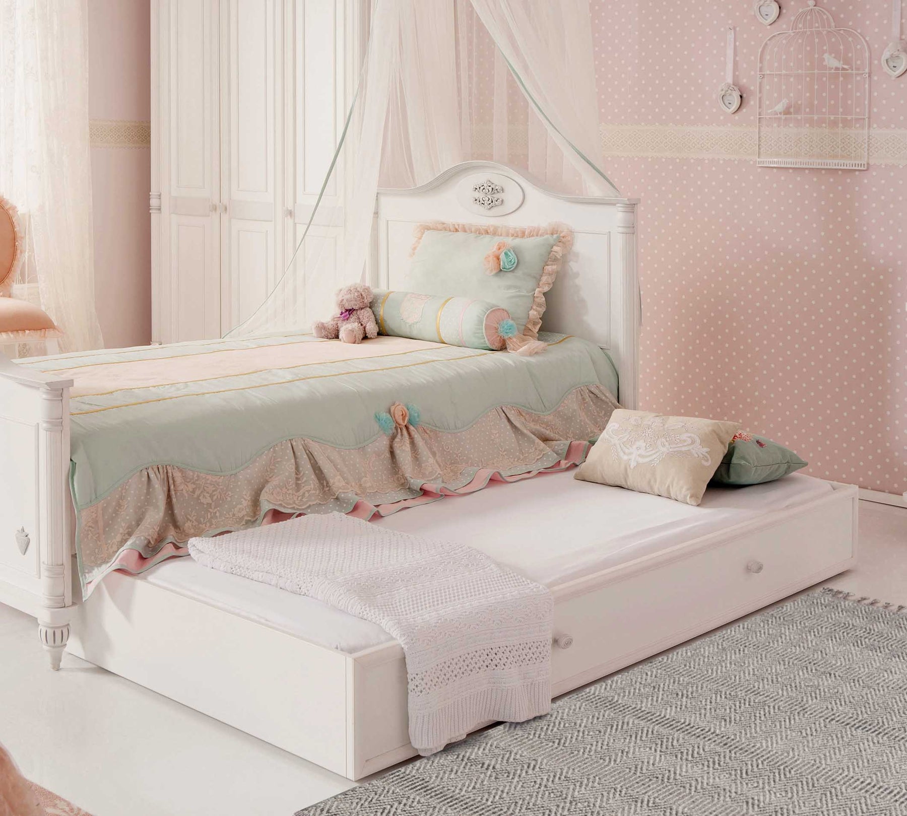 Romantic-Romantica pomoćni krevet / ladica ima višenamjenski dizajn koji možete koristiti za dodatni prostor za odlaganje ili kao dodatni krevet za spavanje. Dimenzije 96x24x193,2cm možete koristiti sa krevetima bez postolja. Proizvod, čiji su točkovi pogodni za manevrisanje, može se lako uhvatiti za ručke i bez napora izvući ispod kreveta i ponovo gurnuti nazad. Kompatibilan sa madracima Bamboo+ Cod. 21.01.1249.00 (90x19x190cm)