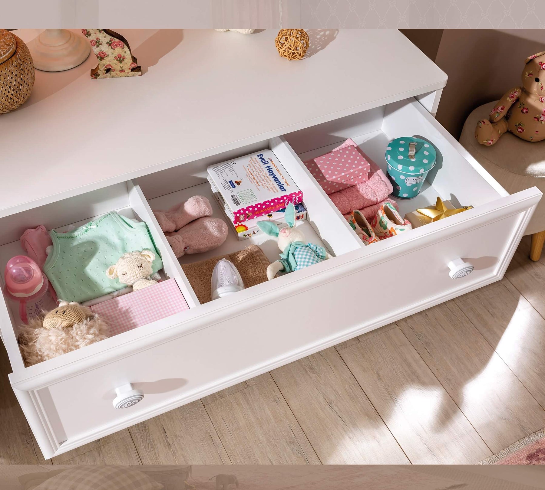 Ako želite da stvari vašeg djeteta uvijek budu organizirane, pomoći će vam 3 pretinca u gornjoj ladici. Zahvaljujući sistemu zatvarača koji se koristi u fiokama, djeca mogu da koriste fioke tiho i bezbedno.