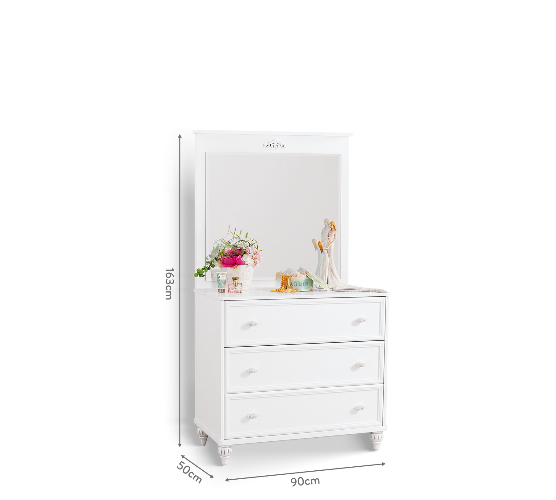 Zahvaljujući aplikaciji bisota i elegantnom bijelom uzorku, šifonjer ogledalo dobija estetski izgled koji unosi jedinstvenu atmosferu u dječju sobu. Dok tvoja djeca sretno odrastaju ispred ovog velikog ogledala, možeš svjedočiti njihovom odrastanju.
