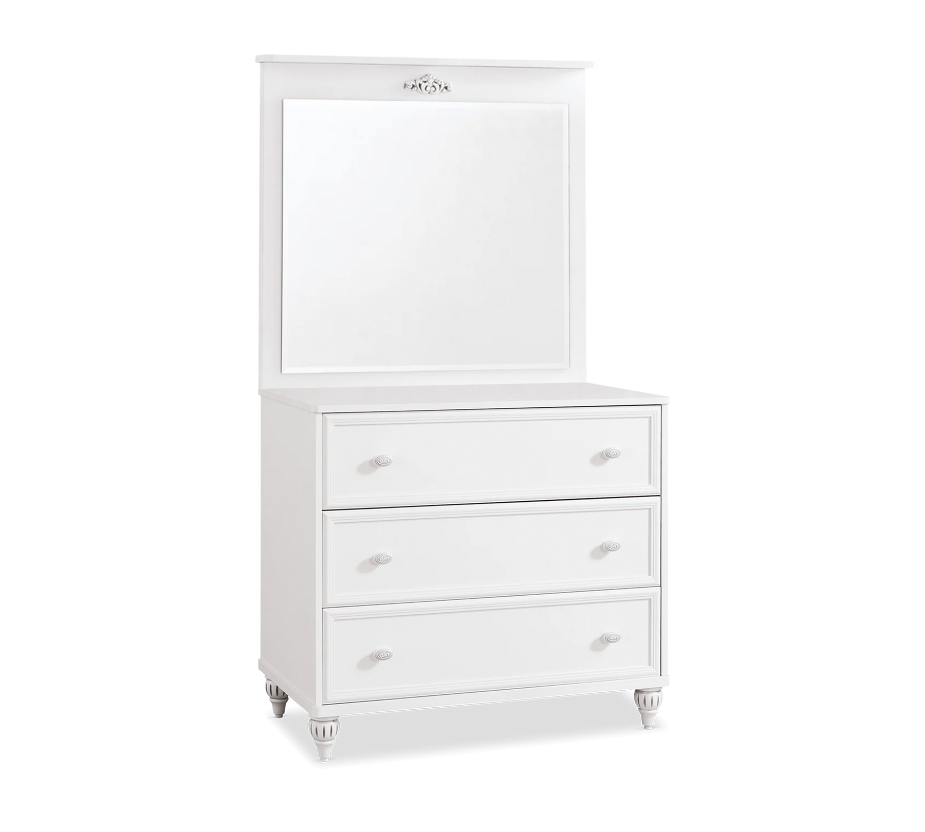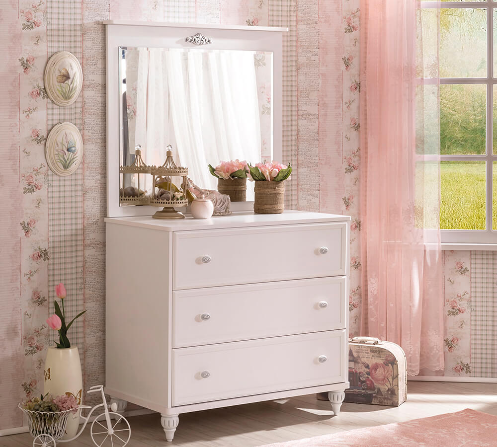 Romantično ogledalo za komodu, crta stil koji odgovara romantičnom, bajkovitom i elegantnom konceptu serije. Možeš s povjerenjem odabrati ovo ogledalo za djecu, jer je napravljeno od kvalitetnih materijala.
